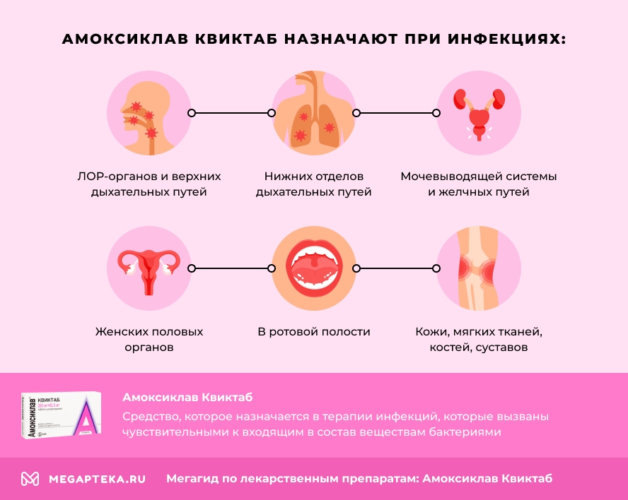 - Amoxiclav Quicktab rozpustné tablety pomáhají při léčbě infekcí způsobených bakteriemi citlivými na kombinaci amoxicilinu a kyseliny klavulanové.